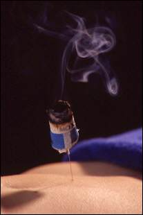 Moxatherapie - Wärmetherapie an bestimmten, dem Krankheitsbild individuell zusammengestellten Akupunkturpunkten oder Zonen.